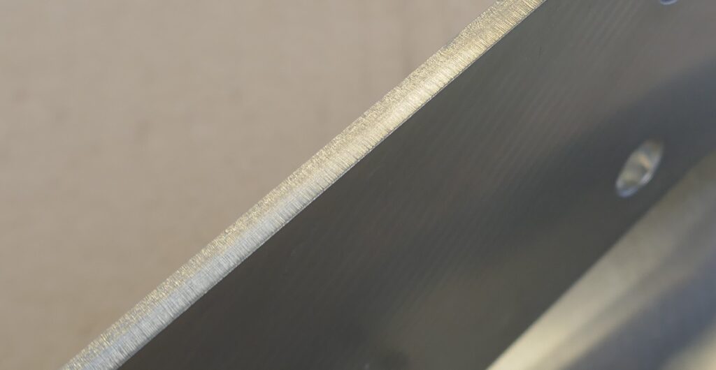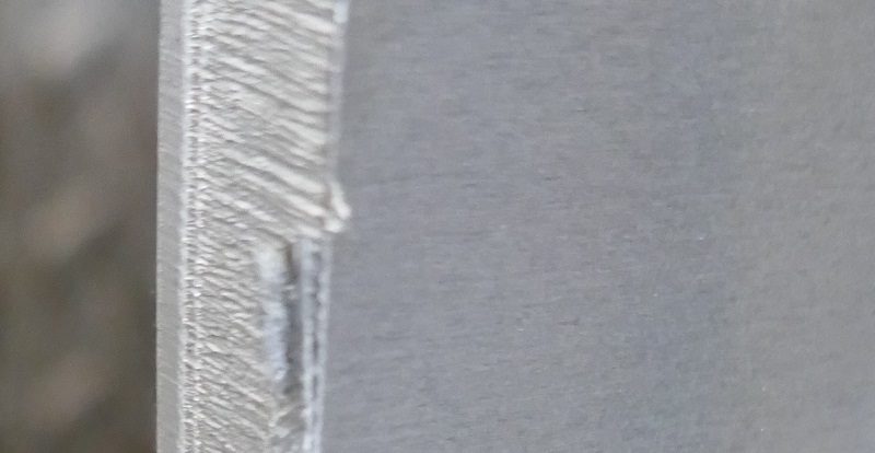 Gratbildung und Rauhigkeit der Schnittkanten nehmen mit der Blechdicke zu, siehe die folgenden Bilder der nicht nachbearbeiteten Kanten. Ab einer Stärke von 2,0 mm werden die geschnittenen Teile von uns entgratet, um Verletzungen an scharfen Kanten zu vermeiden.